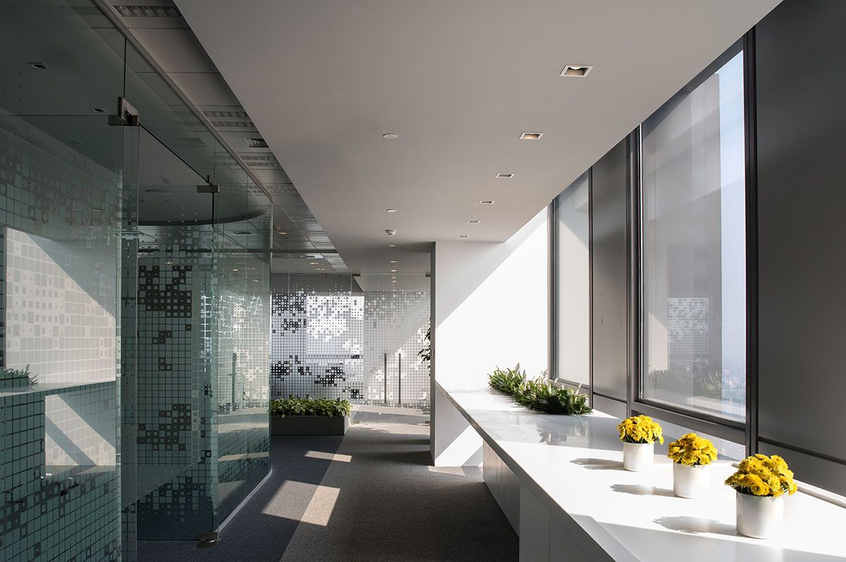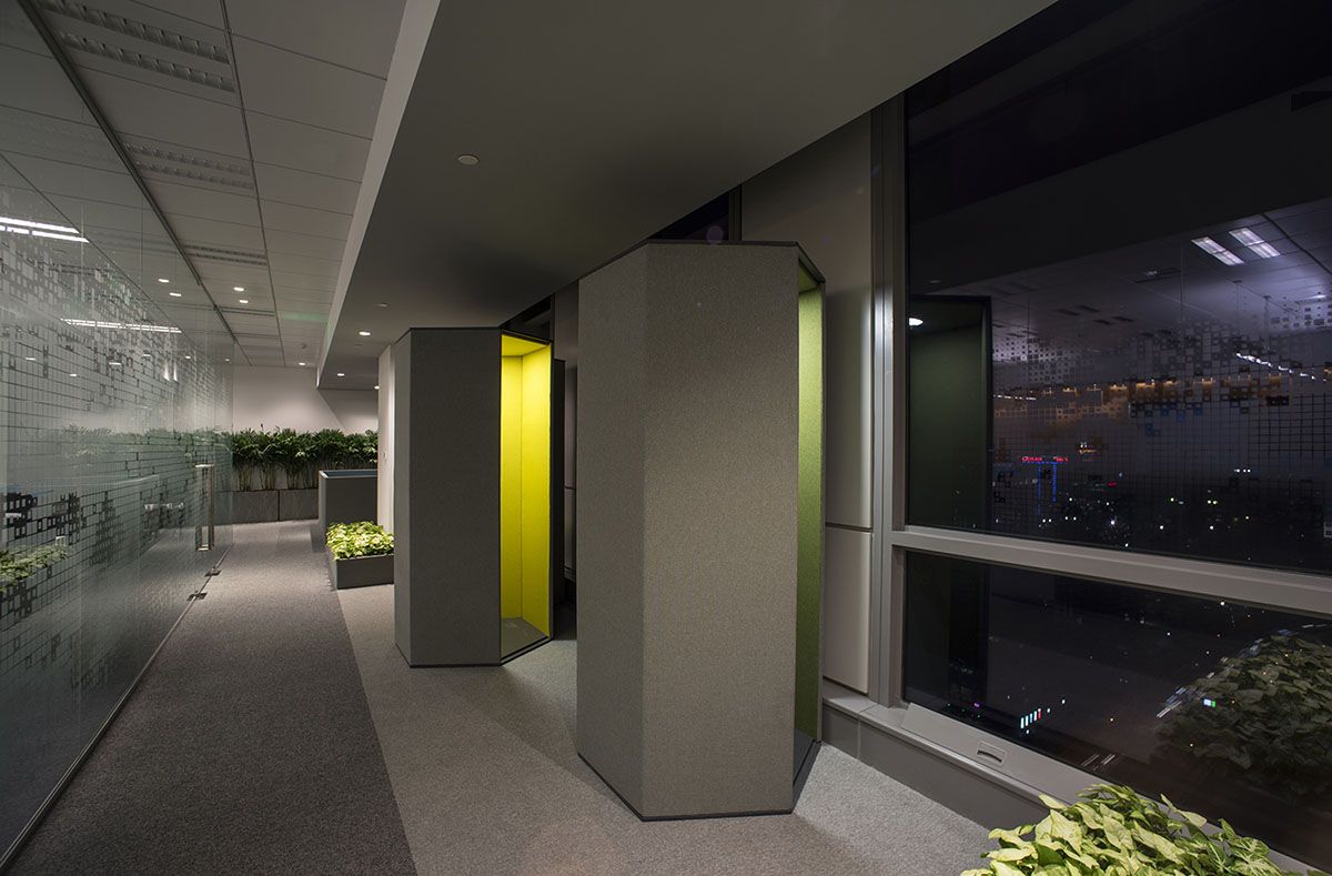 The floor of the whole space is covered with special custom carpets to make it like outside state. Technically, the floor, plants, and lights above the plants are matching well. With purpose of building “a park”, custom furniture is placed between plants. Two main work areas and several functional offices are laid in the “blocks", while central core tube is displayed in the form of a building facade structure. People can actually feel be in the city, also taking a little wander round “the park” is satisfied.