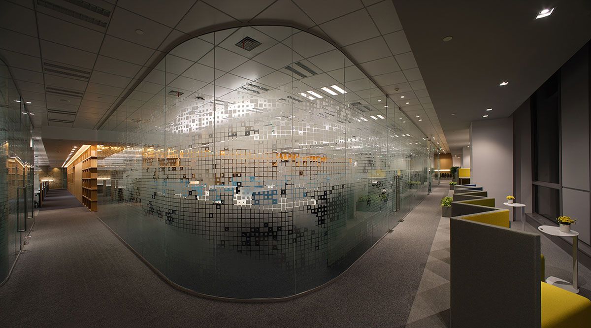 The changes of light with time flow can be truly experienced since natural light comes from all quarters. Artificial "outdoor" light together with natural light creates perfect effects of light and shadow. “Indoor” light is strictly controlled just enough to meets the intensity of illumination. The combination of both “outdoor” and “indoor” light helps to distinguish the difference. Two main work areas are circled by large pieces of glass. On the glass, there are cloud shape patterns made up of translucent small squares. It not only makes better effect of light and shadow on the floor, but also let those who work here feel outdoor atmosphere.